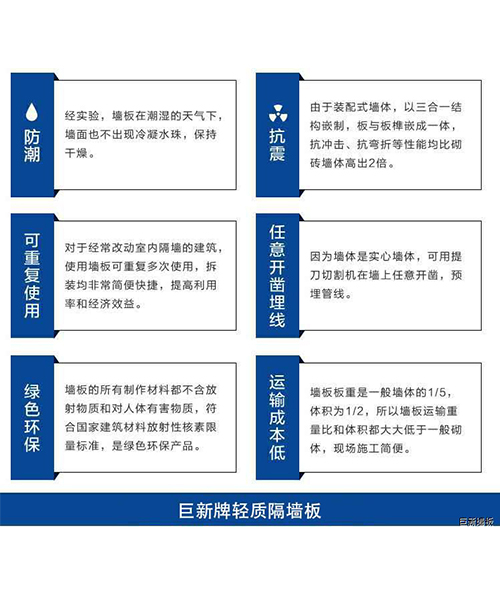 巨新復合實芯墻板質量輕,對于建筑物基礎結構設計,可以優化建筑物結構